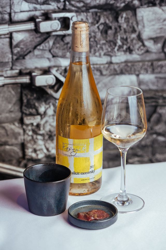 Hra Sashimi, zelená borievka, umeboshi, surový gaštan + Víno Natural Domin & Kušický Pinot Blanc r.2015, Stredoslovenská oblasť