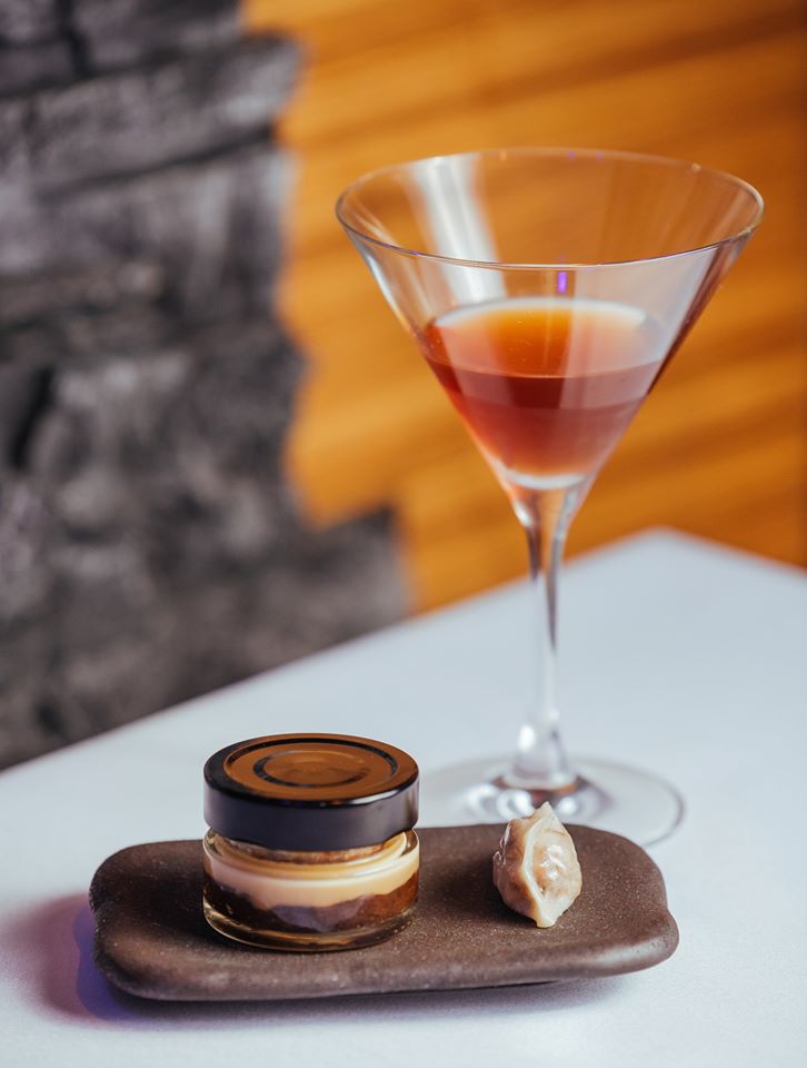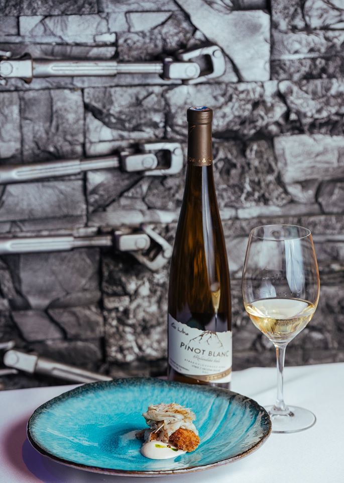 Sépiové lardo, vyprážaný chlieb nasiaknutý kardamónovým mliekom, píniové oriešky + Kasnyik Muškát moravský r.2017, Južnoslovenská oblasť