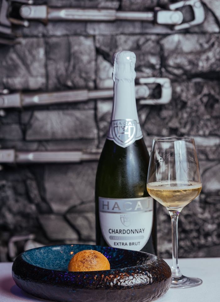 Jahňací mozoček, sterilizované brusnicové bignè + Hacaj Chardonnay Extra Brut r.2016, Malokarpatská oblasť